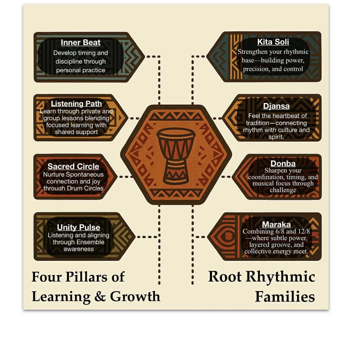 Your journey flows naturally through each stage—from community drum circles to foundational classes (Kita Soli), traditional rhythms (Djansa), advanced triplet work (Donba), expressive groove studies (Maraka), and ensemble performance. Each step deepens your rhythm, confidence, and connection to others.